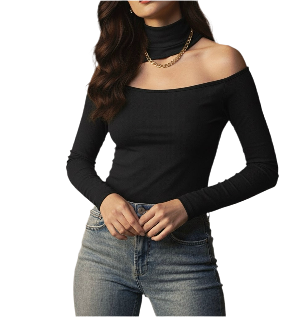 Turn heads in this off-shoulder turtleneck top — where bold meets chic. Designed to hug your figure with a sleek fit, it gives you that effortless statement look for any day or night out. Pair it with your favorite jeans or skirt and own the vibe.